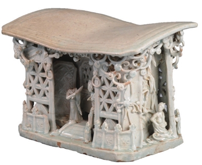 江西省丰城市博物馆收藏的元代青白釉《白蛇传》戏曲人物枕,呈长方形,枕身雕塑成一座仿木结构的彩棚戏台,前后左右共有四个棚台,棚台内有各不相同的演出场面,分别为《白蛇传》中“断桥”“借伞”“还伞”“水漫金山”四出场景。