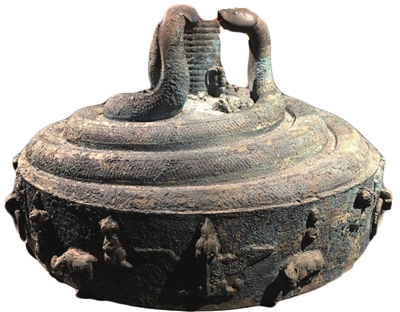 收藏于山西青铜博物馆的蟠蛇纹建鼓座,是全国现已出土的体积和重量最大的青铜建鼓座,器型敦厚雄健,直径77厘米,高47厘米,重80公斤,一根长木柱贯穿鼓身、插入鼓座正中,三条蟠蛇相互纠结盘绕而上,活灵活现。