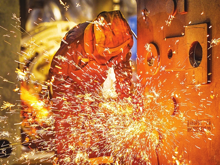2月7日,在浙江省宁波市鄞州区东吴镇的日月重工厂区,工人打磨抛光风电设备部件。