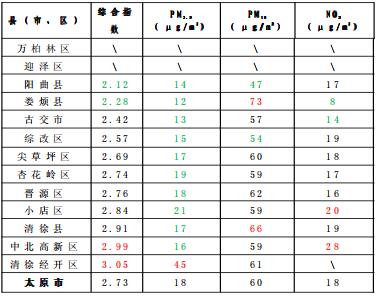 1.综合指数、PM10和NO2指标排名前两位的标为绿色,排名后两位的标为红色;