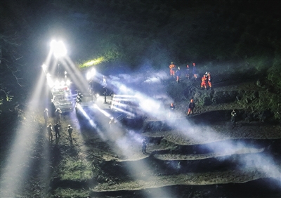 2月9日晚,地上、空中照明照亮了搜救现场(无人机照片)。新华社记者 江宏景 摄