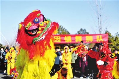 2月9日,河北省石家庄市元氏县群众表演舞狮。 元宵节临近,各地举办丰富多彩的民俗活动,欢欢喜喜迎佳节。 新华社记者 王 晓 摄