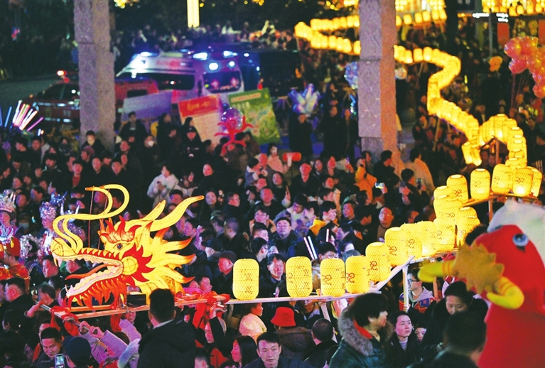2月10日晚,在湖北省宣恩县城兴隆老街,百米板凳龙在人群中游行。 元宵节临近,各地举办丰富多彩的民俗活动,欢欢喜喜迎佳节。 新华社发 (宋 文 摄)