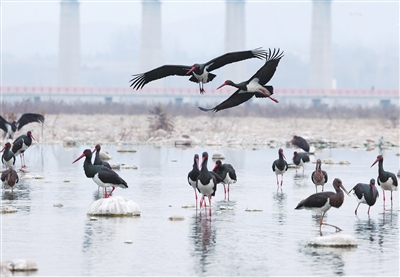 2月11日,一群黑鹳在河北省井陉县境内的绵蔓河内觅食。