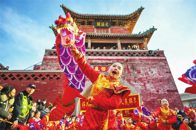 2月12日,在河南省鹤壁市浚县古城,小朋友在进行民俗表演。当日是元宵节,各地举办多彩活动,欢欢喜喜闹元宵。新华社发 (王高超 摄)