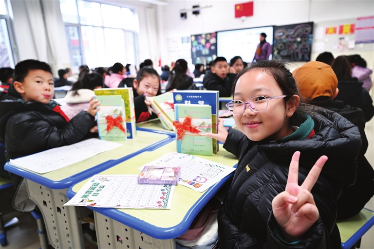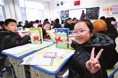 2月16日,宁夏银川市兴庆区实验二小学生在展示领到的新课本。