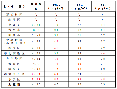 1.综合指数、PM10和NO2指标排名前两位的标为绿色,排名后两位的标为红色;