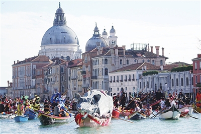 2月16日,在意大利威尼斯,一只大鼠造型的船带领游船队伍前进。当日,威尼斯狂欢节举行船只巡游活动。新华社/欧新