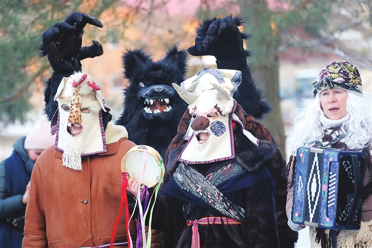 2月16日,在拉脱维亚韦楚姆涅基,人们出席面具节。