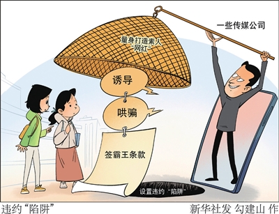 记者调查发现,这家传媒公司先是在网络平台有针对性地“广撒网”,再利用在校大学生不熟悉“网红”行业规则和相关法律条款,诱惑其签约,通过设计不公平的合同内容或进行虚假承诺,导致其陷入法律纠纷。