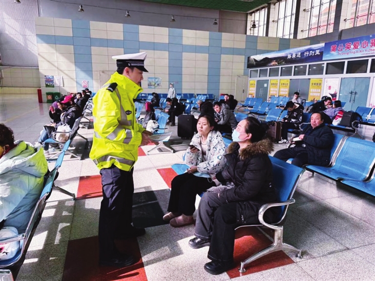 民警在客运站点摆放交通安全宣传展板,向出行群众发放安全宣传资料,通过电子显示屏发布春运主题“两公布一提示”,对场站人员、驾驶员、乘客开展交通安全教育。民警向驾驶人和乘客面对面讲解酒驾、无证驾驶、超员、超速及不系安全带等交通违法行为的危害,结合典型事故案例向驾驶人及乘客分析道路交通事故发生的原因及后果,向客运驾驶人讲解驾驶陋习的危害,讲解开车应注意的细节,教育驾驶人要保证车况良好,规范操作、文明行车,提醒乘客一定要系好安全带、文明乘车、安全出行。