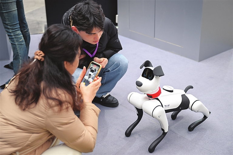 2月21日,观众在2025全球开发者先锋大会现场与机器狗互动。2月21日至23日,以“模塑全球 无限可能”为主题的2025全球开发者先锋大会在上海举办。新华社发