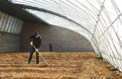 2月22日,杏花岭区东坪村蔬菜大棚内,农民在管护菜苗,为大棚增收增产打好基础。牛利敏 摄
