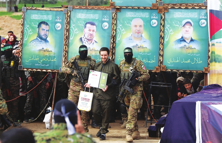 按照法新社说法,自停火协议1月19日生效以来,以方被扣押人员获释前都会被蒙面的巴方武装人员示众,并被强迫向围观的加沙地带民众挥手致意。哈马斯将以方被扣押人员移交红十字国际委员会前,还会向以方人员“颁发”用希伯来语写的“获释证书”。