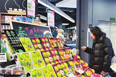 2月25日,万柏林区某超市,消费者在选购枇杷、青枣等外地时令水果。随着物流业的快速发展,我市市场上的时令水果品种越来越丰富。王韵菲 摄