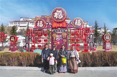 2月28日,游客在拉萨布达拉宫前合影留念。
