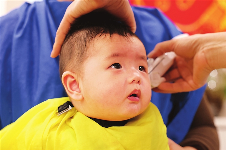 3月1日,小朋友在山东省枣庄市一家婴幼儿专业理发店理发。当日是农历二月初二,我国民间有“剃龙头”的习俗,不少人们来到理发店理发,为新的一年讨个好彩头。