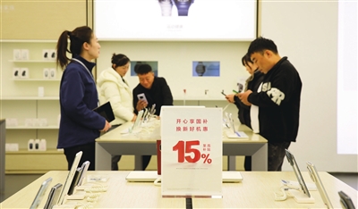 3月3日,杏花岭区某数码店内,“国补”海报摆放在醒目位置,前来咨询购物的市民络绎不绝。随着2025年“国补”政策持续深入实施,我市消费市场迎来一波手机消费热。王韵菲 摄