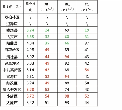 1.综合指数、PM10和NO2指标排名前两位的标为绿色,排名后两位的标为红色;