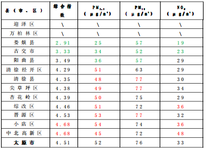 1.综合指数、PM10和NO2指标排名前两位的标为绿色,排名后两位的标为红色;