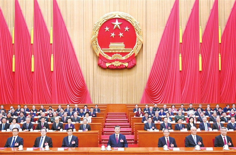 习近平、李强、王沪宁、蔡奇、丁薛祥、李希、韩正和大会主席团成员在主席台就座。