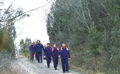 3月11日,晋祠镇护林防火检查站队员在天龙山野外巡防。3月至5月是我市森林防火重点期,相关部门多措并举,全方位筑牢森林防火责任墙。郭苑甫 摄