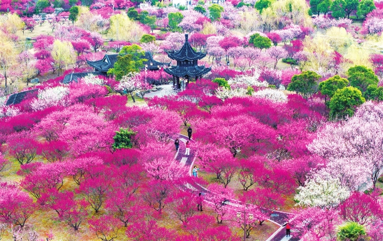 3月15日,游客在江苏省盐城市大丰区梅花湾景区赏花游玩(无人机照片)。春暖花开,万物复苏,生机盎然的春日画卷在神州大地徐徐展开。新华社发(周社根 摄)