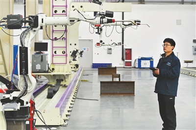 3月28日,山西中北汇科智能装备有限公司生产车间,工作人员正在对XB系列(9轴)机器人焊接工作站进行调试。据了解,该工作站无需人工引导,通过机器人逆向建模即可自动生成焊缝并匹配焊接工艺,实现自动焊接。郭苑甫 摄