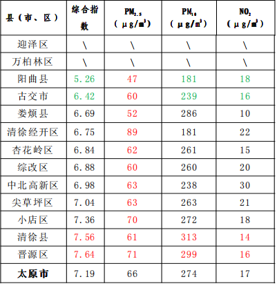 1.综合指数、PM10和NO2指标排名前两位的标为绿色,排名后两位的标为红色;