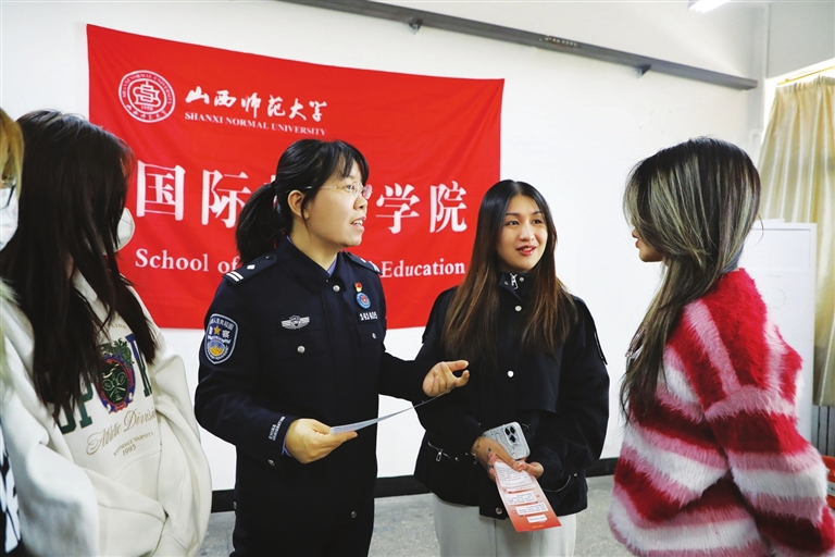 为深化涉外法治宣传教育,助力在晋留学生知法、守法,了解出入境法律常识,四月一日上午,山西出入境边防检查总站执勤四队联合山西师范大学国际交流与合作部开展“国门答疑、情暖学途”普法宣讲活动。米国伟 杨 君 马延超 摄影报道