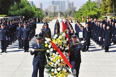3月31日,太原南车站派出所联合榆次车站派出所组织民警赴双塔革命烈士陵园开展清明祭扫活动。王韵菲 董 杰 摄影报道
