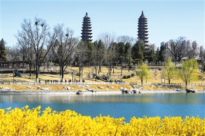 4月2日,游客漫步双塔公园,享受春景。牛利敏 摄