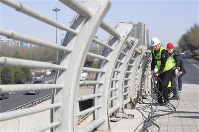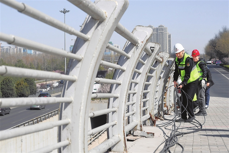 4月1日,市市政建管中心市政桥梁管理所启动市区桥梁悬挂线缆乱象整治行动。工作人员将重新规整并规范绑扎线缆,为市民打造更加安全、美观的城市桥梁通行环境。图为工作人员在东中环下穿长风东街桥面施工。