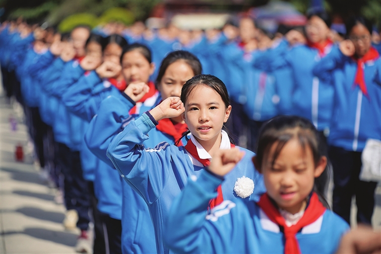 4月2日,山西省运城市海仓学校学生在盐湖区烈士陵园烈士纪念碑前宣誓。