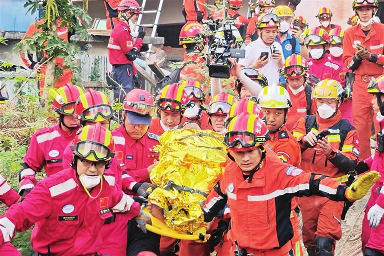 当地时间4月2日17时40分许,中国救援队伍在缅甸曼德勒市金色乡村酒店救援点成功救出一名男性,该男子为酒店员工,已被困超过120小时,被救出时生命体征良好。该名幸存者已转交缅甸当地医疗机构进行后续治疗。这是中国救援队伍救出的第9名幸存者。新华社发
