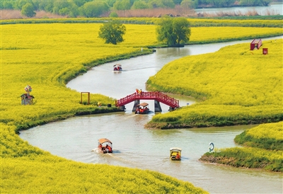 4月3日,游客在江苏省高邮市湖上花海景区赏花游玩(无人机照片)。