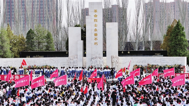 4月3日,银川市北塔中学学生在银川市烈士陵园参加祭扫活动(无人机照片)。