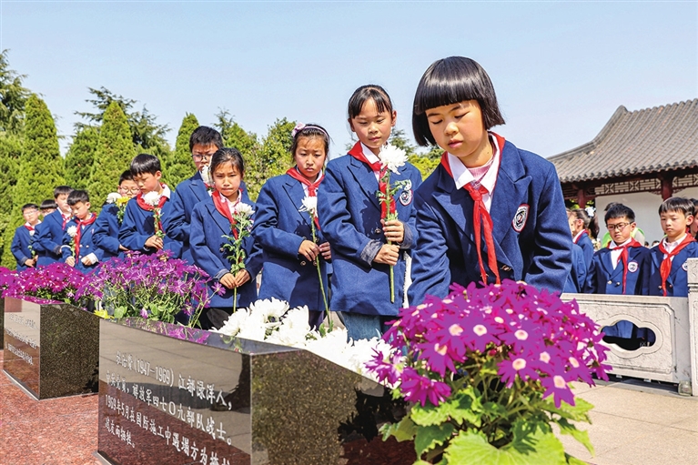 4月3日,江苏省扬州市江都区华君外国语学校学生在江都革命烈士陵园向烈士献花。