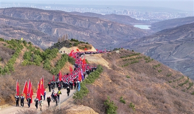 4月3日,参加徒步祭英烈活动的师生在翻越黄峁山(无人机照片)。