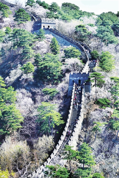 4月5日,游客在北京慕田峪长城游览。