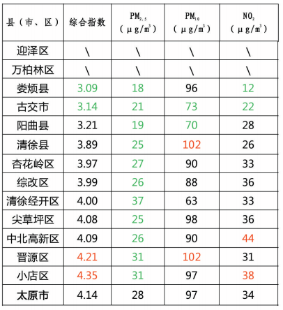 1.综合指数、PM10和NO2指标排名前两位的标为绿色,排名后两位的标为红色;