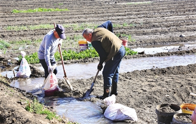 4月9日,晋源区晋祠镇东院村,村民们正在田间进行春耕灌溉。该区积极调配水资源,保障农田灌溉。牛利敏 李玉锁 摄影报道