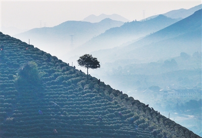 4月7日,采茶工在浙江安吉县溪龙乡黄杜村大山坞自然村的茶园里采摘春茶(无人机照片)。