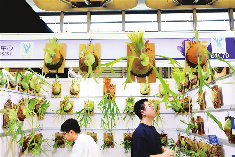 4月10日,工作人员在展览会现场布置一组鹿角蕨展品。