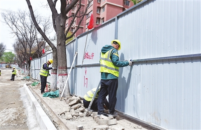 4月11日,太原市市政建管中心对工地围挡进行加固,以应对极端大风天气。牛利敏 杨 斌 摄影报道