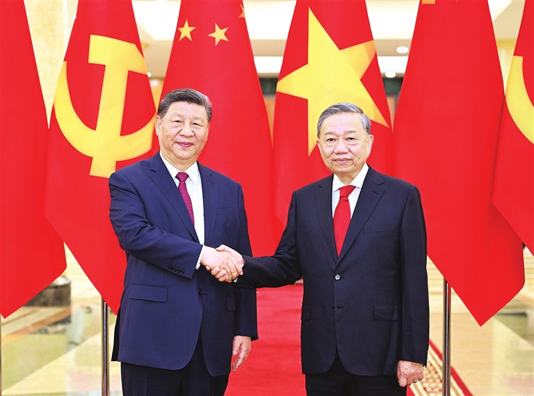 习近平强调,今年是中越建交75周年暨“中越人文交流年”。75年来,无论国际风云如何变化,双方在争取国家独立和民族解放的斗争中相互支持,在社会主义建设事业中携手并进,在推进各自现代化进程中砥砺前行,成为社会主义国家团结合作的典范。面对变乱交织的国际形势,中越两国坚持和平发展,深化友好合作,为世界带来了宝贵的稳定性和确定性。站在新的历史起点上,双方要继往开来、携手前行,赓续“越中情谊深、同志加兄弟”的传统友谊,按照政治互信更高、安全合作更实、务实合作更深、民意基础更牢、多边协调配合更紧、分歧管控解决更好的“六个更”总体目标,高质量推动全面战略合作,确保中越命运共同体建设行稳致远,为构建人类命运共同体作出新的更大贡献。