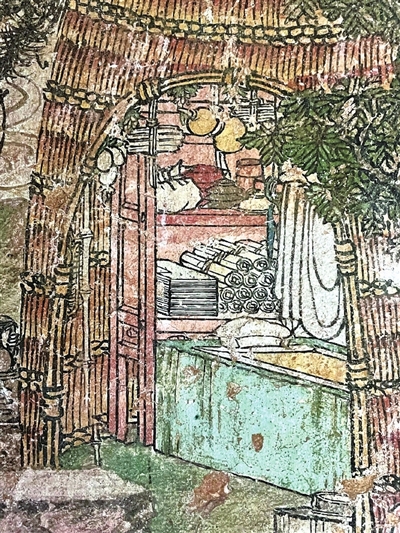 高平开化寺北宋壁画中的“草庐读书”场景中,南窟仙人与北窟仙人的草庐内,床头摆放着两种书籍:传统的卷轴与宋代新兴的折页本。书卷旁还绘有瓷枕、衣物、煮茶炉具等生活用具,构成了一幅文人独居读书的完整画面。