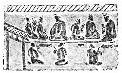 “庠序画像砖”展现了东汉时期开学的场景。画面呈现一长廊式房舍,左侧有一门。房内设置长席,席上分坐六人,皆头戴冠冕,身着袍服。左侧三人,其中二人并坐交谈,一人手持牍卷待命。右侧三人,一人手势生动,正在讲解,一人端坐静听,另一人专注于手中之物。长席前是摆放着简牍的几案,中央有一盛水小盂。画面下部三人,皆佩戴帻(汉代头巾),两人手持牍卷等待,一人握长竿。这里为一人单独设立了一个席位,大抵因为其是年长者。庠序是汉代地方设立的教育机构。《汉书·平帝纪》记载,元始三年(3)设立学官,郡国设学,县、道、邑、侯国设校,学校配备经师一人。乡设庠,聚设序,庠、序各置《孝经》师一人。