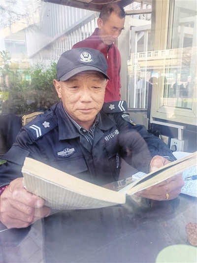 我接着认识的是老张,他也是个喜爱读书的人。与老王移动的“书房”——三轮车相比,老张则拥有一个固定的“书房”。他的“书房”约一平方米,是单位为看车棚者搭建的遮风避雨的小屋,四面全是玻璃,从外往里看,一览无余。之前我每每从那里经过,都能看到老张常常捧着一本书在读,无论春夏,抑或秋冬,他一直保持着这个习惯。虽已是奔60岁的人了,可读书的模样不亚于一位少年郎。