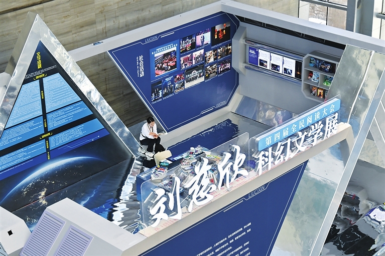 作为中国科幻文学领军人物,刘慈欣以奇瑰宏阔的想象力、细腻动人的笔触描绘了宇宙的运动形态、人类的可能未来。如同科幻作品给人新奇之感,刘慈欣科幻文学展也别具一格,白色“太空舱”造型让人眼前一亮,同时还有镜子般的地面,梦幻般的环境让观众有了穿越时空的感觉。在“太空舱”里,《三体》《乡村教师》《黑暗森林》等科幻文学作品集中展示,带领读者欣赏瑰丽多姿的宇宙世界。